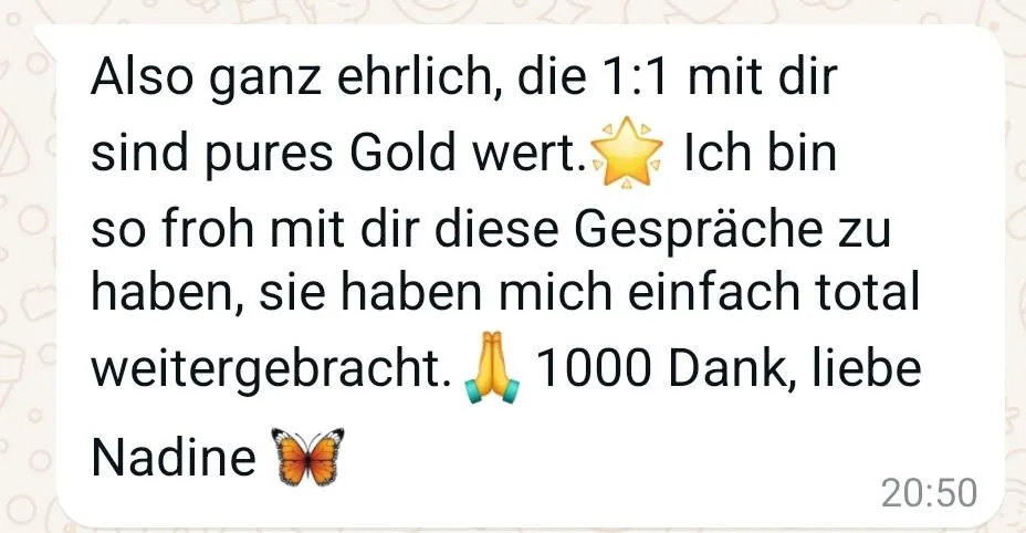 „Ich habe schon in den ersten Tage so krasse Veränderungen gehabt, sowohl emotional als auch einen klaren Plan für meinen Business Aufbau. Nadine hat einfach direkt gesehen, was es für mich brauchte.“